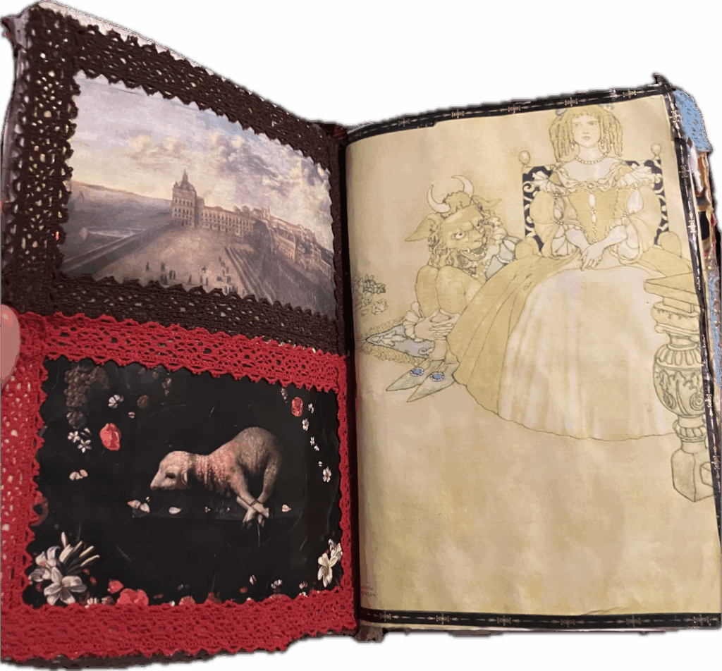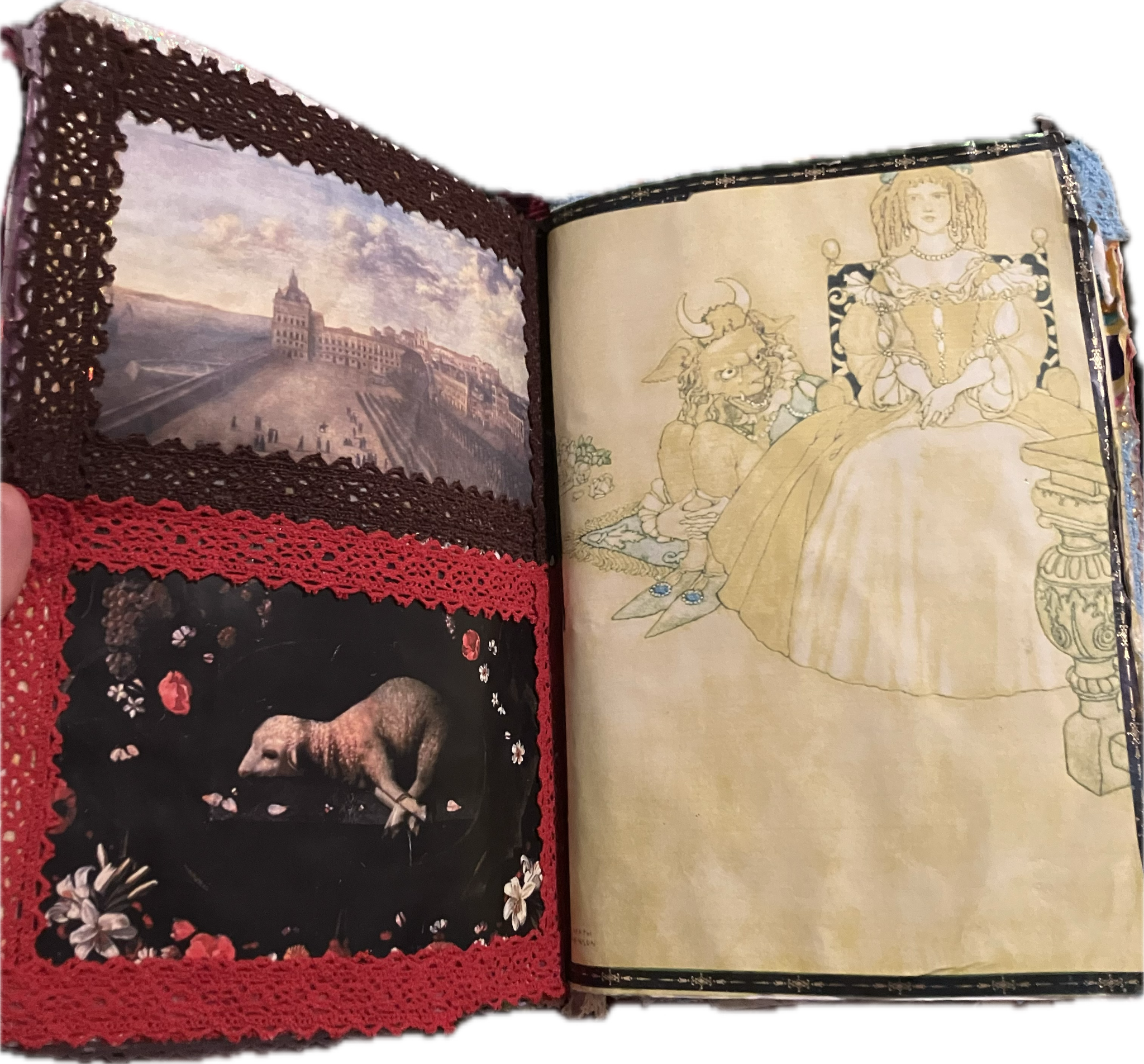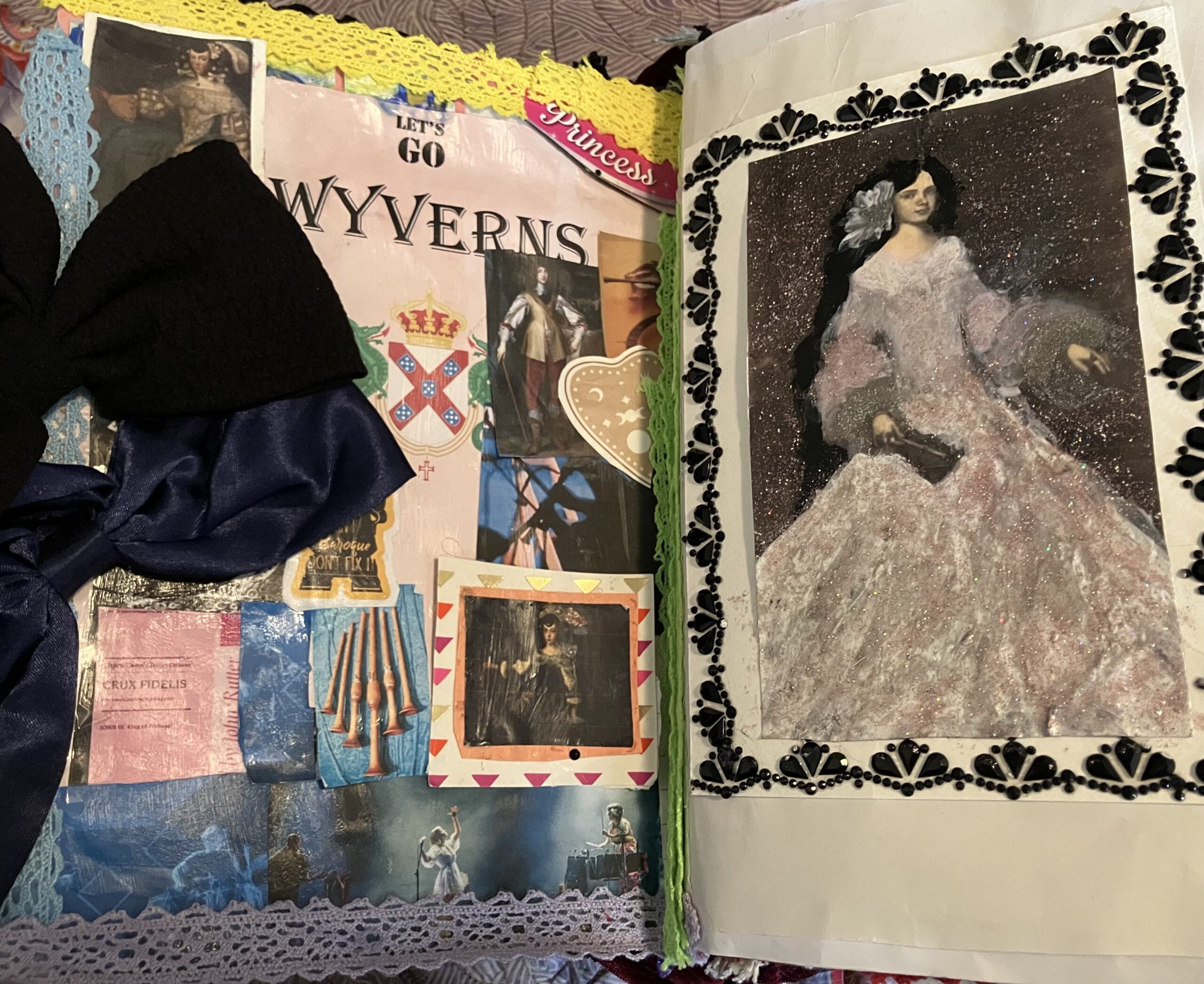 The literal base of the book is a composition book. The page trimmings I included were mainly lace, pearl, Washi and beads tapes. I used some scrapbook paper here and there. I’d include some stickers, very few magazines clippings, but I printed off the majority of the pictures myself. (SO many talented artists!)