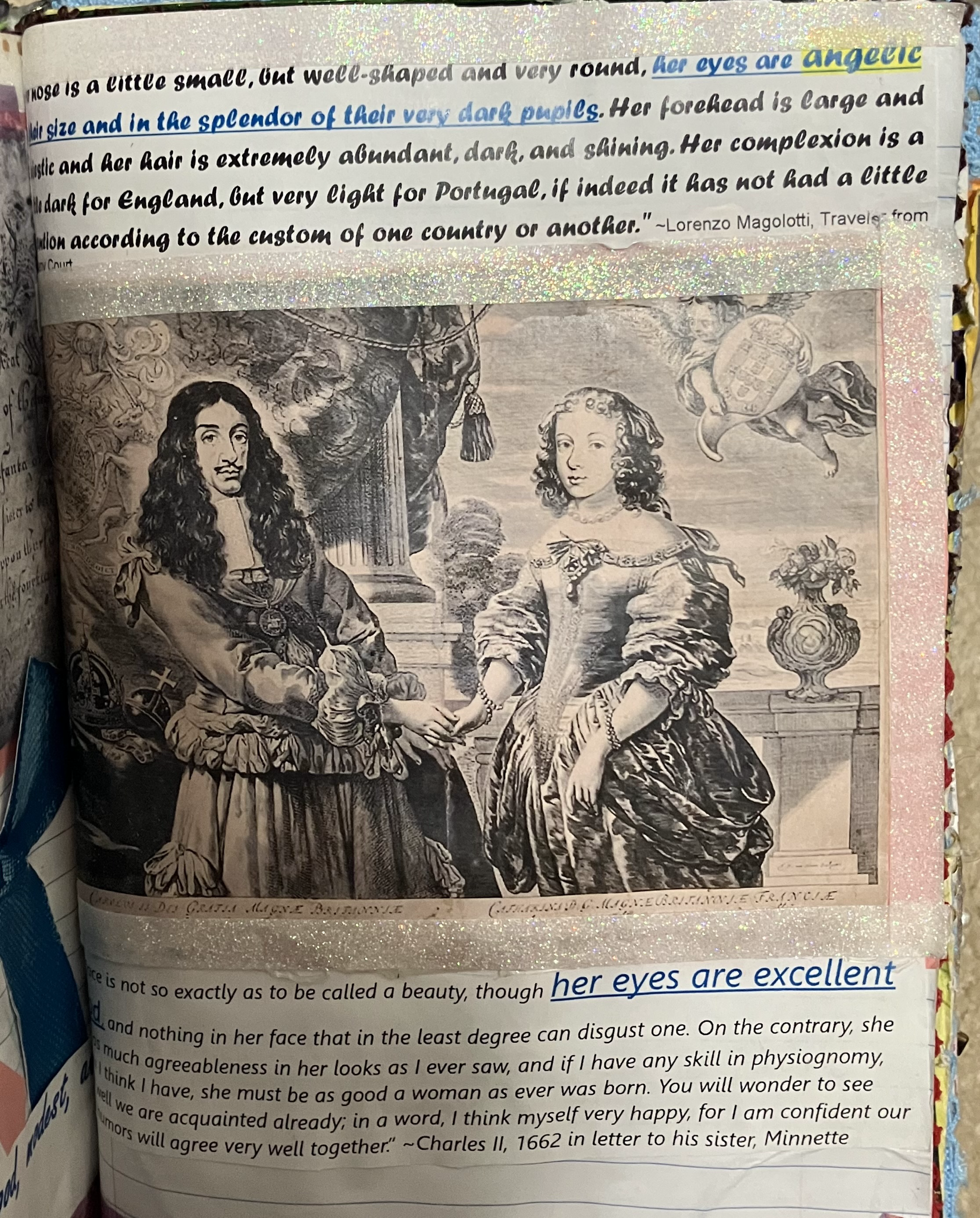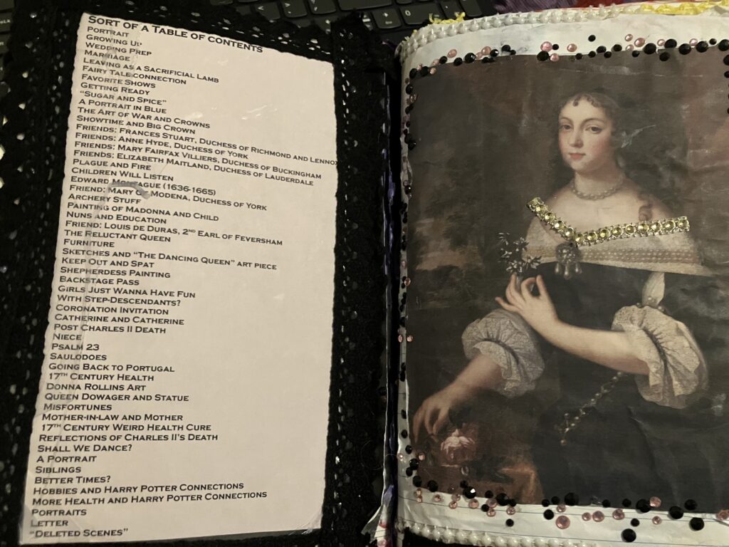 So hopefully the 17th century Queen would enjoy it-and notice that I mindfully didn’t include flower embellishments. Too bad because I love flowers. Though Catherine of Braganza portraits feature flowers, she didn’t always appreciate them. I heard something about how her husband gave bouquets to his girlfriends, and flowers gave her some sort of PTSD. One could hardly blame her.