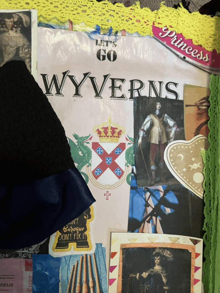 The biggest thing to stand out is a “speculative” banner that she would have held at a game that says, “LET’S GO WYVERNS.” The wyvern is the mascot of the Braganza House. Family/school spirit!
